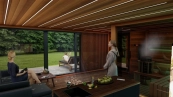 Dřevěný nástěnné panely. Díky jedinečných ručně vyráběných dřevěných tieňacích systémů, které doplňují bronzové zasklení jsou interiéry sauna domu ještě útulnější.