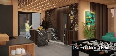 .V prostoru kombinované sauny si příznivé účinky horké finské sauny a detoxikační účinky infrasauny může vychutnat i širší rodina a parta přátel. V kombinované sauně je umístěna i himálajská solná stěna postavená kolem saunových kamen, která ještě intenzivněji působí na dýchací cesty a pokožku. Po saunování je osvěžení zajištěno ve vodním bloku, kde si v pohodlné šatně lze odložit ručníky, župany a saunové oleje potřebné k saunování. Z hlediska interiérového designu v souladu s architektonickým trendem prostředí dominují přírodní tóny a textury, vznikají formální praktická a elegantní řešení. Ve vnitřních společenských prostorách jsme použili jedinečně navržené dřevěné obklady stěn z kanadského červeného cedru I. třídy se skrytým LED osvětlením. Jedinečně navržené dřevěné obklady stěn a skryté osvětlení pokračují až po strop a tvoří tím s interiérem celek.