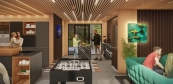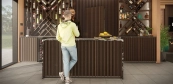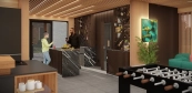 Prvky z masivního kanadského červeného cedru jsou kombinovány s thermowood jasanem. Použitím čokoládově hnědého thermowood jasanu jsme dosáhli přirozeného kontrastu mezi dřevěnými obklady stěn. Barové pulty z masivního dřeva vytvořené na míru sledují linie designových prvků.